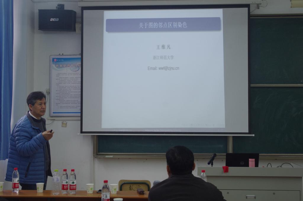 王维凡教授报告的题目是“关于图的邻点区别染色”。重点介绍了图的邻点(和)可区别边(全)染色的概念、相关猜想、研究进展以及今后的研究方向。王维凡教授同时分享了浙江师范大学数学与计算机科学学院的师资队伍、科研平台等方面的信息,并鼓励广大同学积极报考浙江师范大学的硕士研究生。
