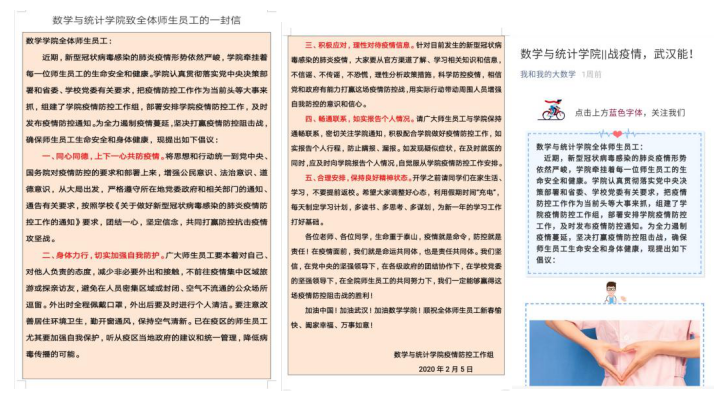 一、深化思想认识,强化工作部署。在学院党总支的带领下,迅速成立学院疫情防控工作组,在线上召开会议进行工作分工安排。要求全体党员和管理人员提高政治站位,将思想统一到学校党委决策部署上来,坚决贯彻落实好疫情防控工作。全体党员在疫情防控期间,思想认识深刻,主动担当作为,扎实做好重点任务,贴心服务师生。为确保工作落地落实做细,学院疫情防控工作组利用学院微信公众号“我和我的大数学”发出《致beat365中文官网全体师生员工的一封信》,在共防疫请、自我防护、不信谣不传谣等多方面,做好师生教育管理等工作的筹划与组织。