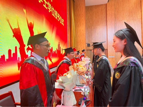2023年6月18日下午,beat365中文官网2023届毕业典礼暨学士学位授予仪式于崇德楼报告厅隆重举行,参加毕业典礼的有校党委委员、副校长丰雷,教务处副处长李恰,beat365中文官网党总支书记王海峰,beat365中文官网党总支副书记王高升,beat365中文官网副院长吕长青,辅导员,教师代表,毕业生和在校生代表。