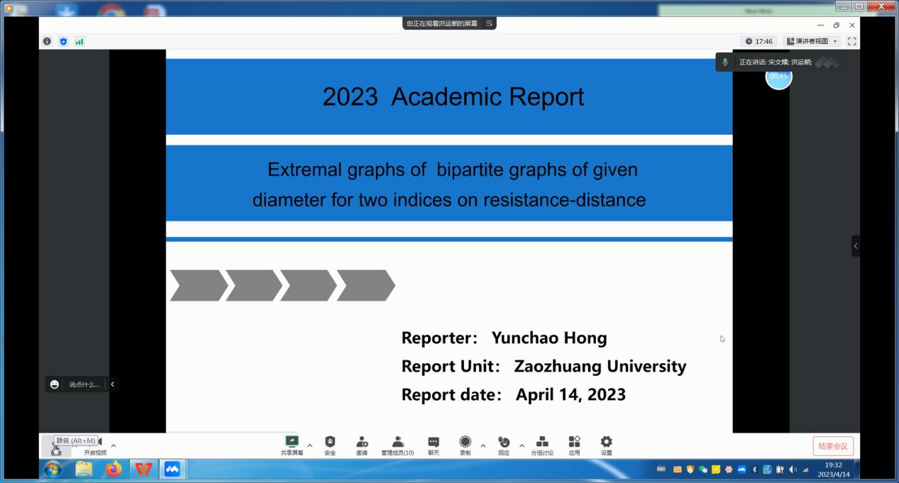 4月14日下午,中国矿业大学数学学院洪运朝博士应邀为beat365官网教师作主题为“Extremal graphs of bipartite graphs of given diameter for two indices on resistance-distance”的学术报告。beat365中文官网运筹学与控制论科研团队教师参加会议,科研秘书宋文耀老师主持报告会。
