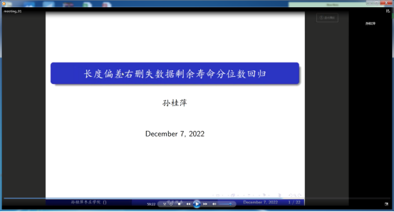 孙桂萍老师作了题为《长度偏差右删失数据剩余寿命分位数回归》的学术报告。报告内容为长度偏差数据下剩余寿命分位数模型,考虑了协变量对剩余寿命的影响首先针对长度偏差右删失数据的剩余寿命分位数提出了对数形式的线性回归模型,  对删失变量与协变量独立和不独立的两种情况利用估计方程给出了模型参数的估计. 其次, 通过推导和证明给出了参数估计的相合性和渐近正态性.最后,  对提出的估计方法进行了数值模拟以检测所提出方法的可行性.