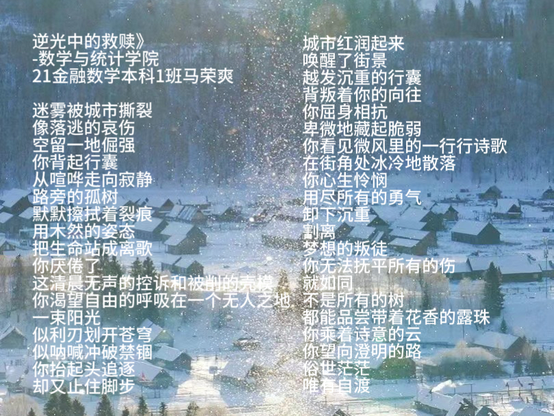 为了引导同学们感悟生命美好,理解生命责任,进一步探索生命价值,10月17日至10月20日期间,beat365中文官网举办了以“用阳光之心,展生命之美”为主题的诗歌大赛。同学们积极参与,积极踊跃投稿。