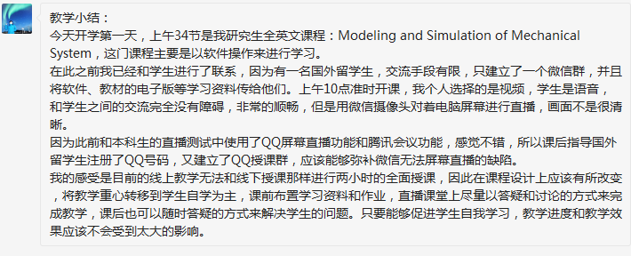 今天是开课第一天,今天上午学院教学管理团队、各系主任和专业负责人,全程在线关注学院网络教学情况。学院第一时间将上午已开课的15位教师的课堂情况反馈进行统计分析,及时对下午开课的17门课程进行指导反馈,为随后开展的教学做好充分准备。从反馈来看,老师们事先工作准备充分,同时作好了腾讯会议、QQ群等网络教学“双平台”技术应急准备,对雨课堂卡顿、堵塞等情况进行了及时应急处理。课堂教学秩序良好,在首次正式网络教学中,全部顺利完成教学任务。(以下为部分热心老师和学生的反馈)
