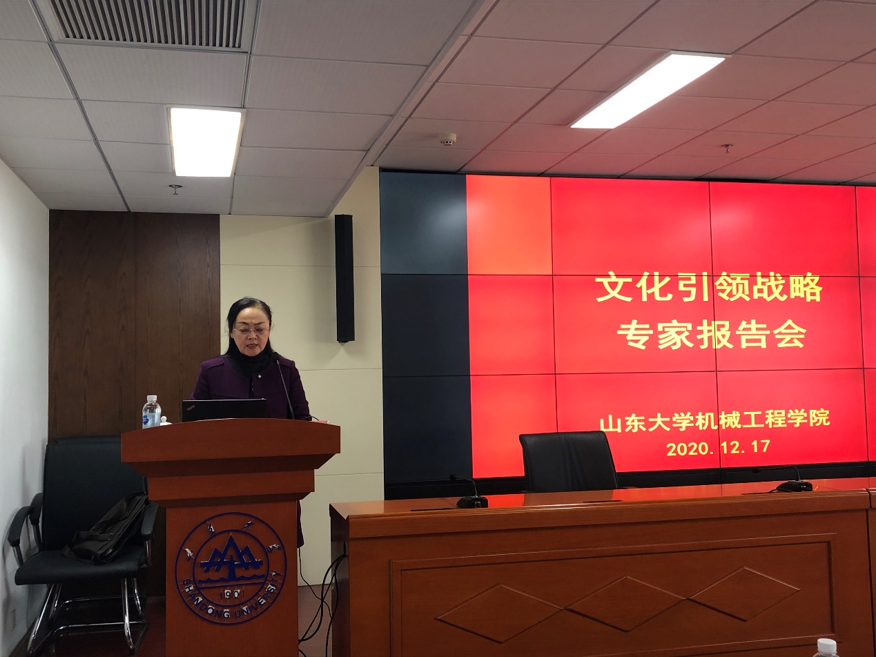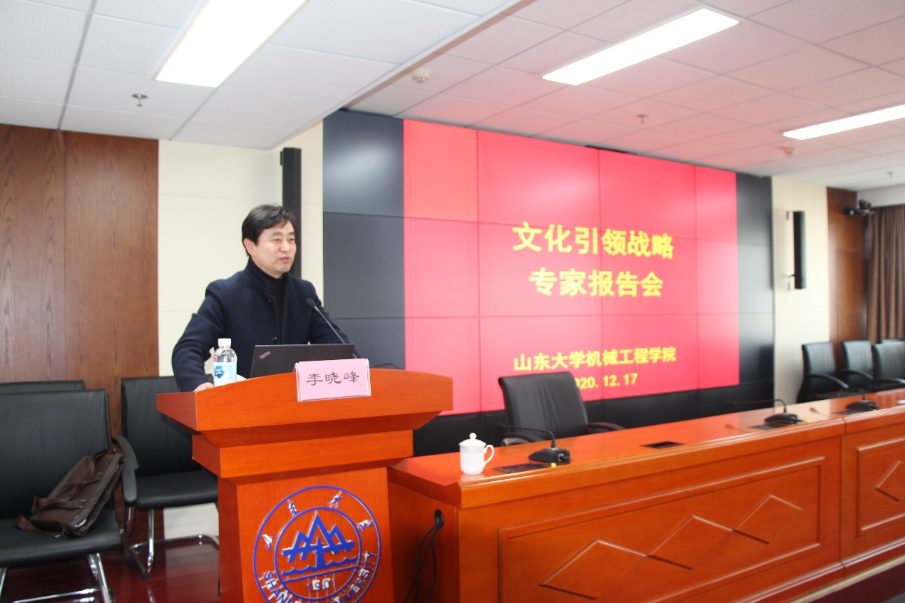 12月17日下午,beat365在线唯一官网在创新大厦1103举办了文化引领战略专题报告会,报告会邀请艺术学院党委书记、威海校区艺术学院院长李晓峰教授作了题为“百廿学府与文化引领战略”的报告。beat365在线唯一官网院长黄传真、党委书记刘杰及领导班子成员、机关全体人员、教师党支部书记、35岁以下青年教师、师生代表参加了报告会。报告会由学院党委书记刘杰主持。