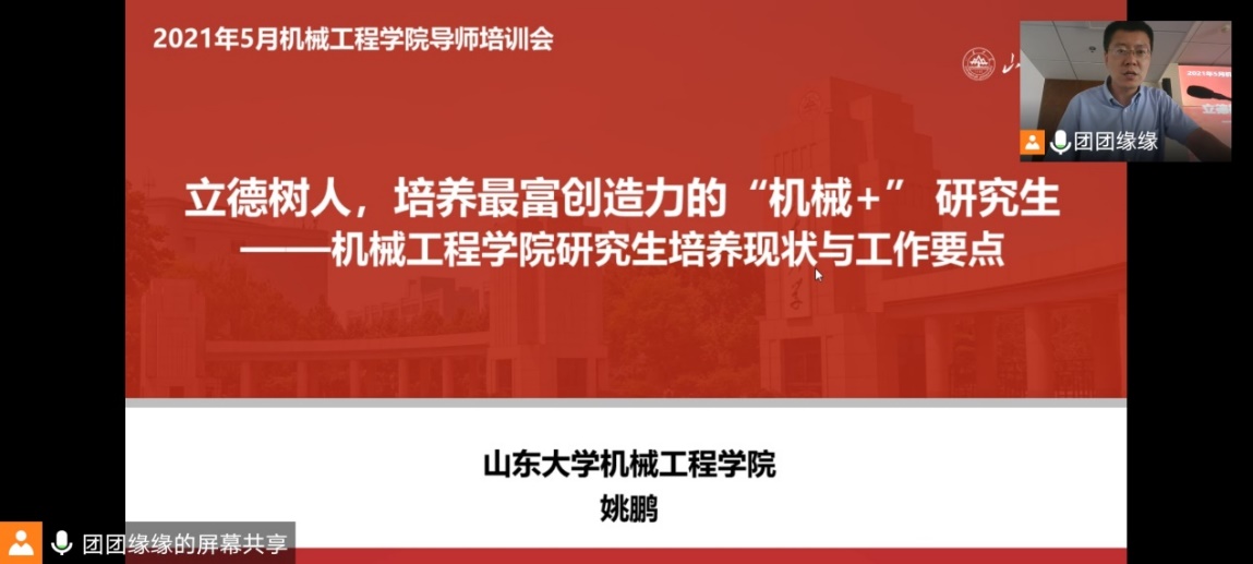 机械学院高度重视教师思想政治教育和师德师风建设,开展系列师德师风建设活动,有效提升了教师立德树人的使命感。此次 “立德树人、培养最具创新力的"机械+"研究生专题导师培训会”是学院组织的导师培训系列活动之一,是学院贯彻落实全国研究生教育会议精神的重要举措、全面提升研究生培养质量的有效途径。本次专题培训会采取线上线下相结合的形式开展,副院长姚鹏主持了培训会,70余名导师参加了现场培训,40余名导师线上参会。