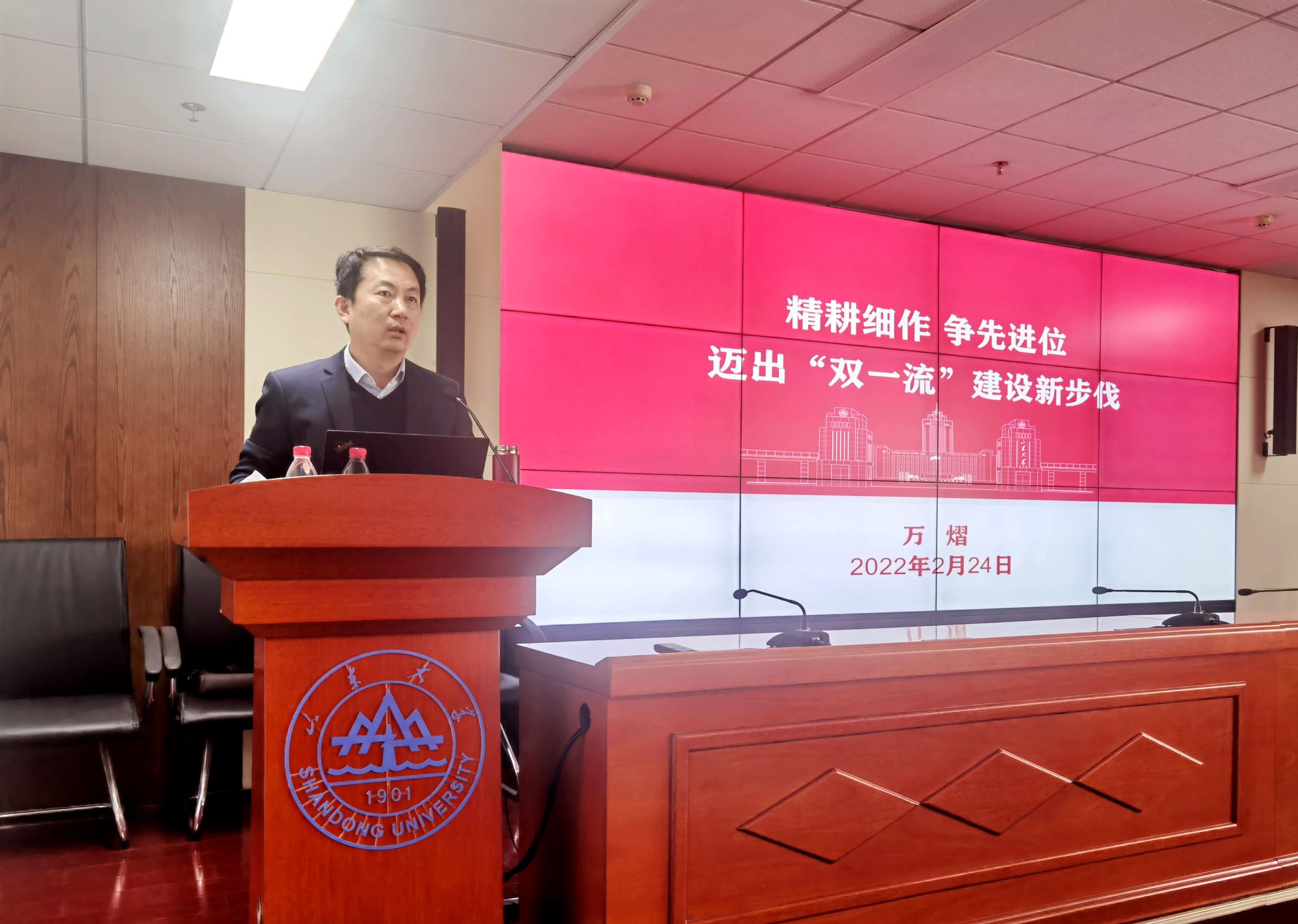会上,万熠院长代表学院班子作新学期工作报告。他首先传达了春季新学期工作会议精神,分析解读了学校2022年工作要点9个方面31项重点任务,要求全院教职工深刻理解并找准把握好国际坐标、国家坐标、山东坐标、高教坐标和山大坐标,落实新要求、展示新气象。其后,他结合学院“十四五”规划推进、学院班子任期目标制定,在梳理查找学院改革发展难题基础上,进一步对标国内、校内先进示范,从彰显党建领导优势、着力加快改革创新、落实立德树人根本任务、着力建设一流人才队伍、着力增强学术核心竞争力、着力强化支撑保障六个方面对本年度和新学期重点工作进行部署,进一步聚焦和明确了学院发展目标和改革任务。