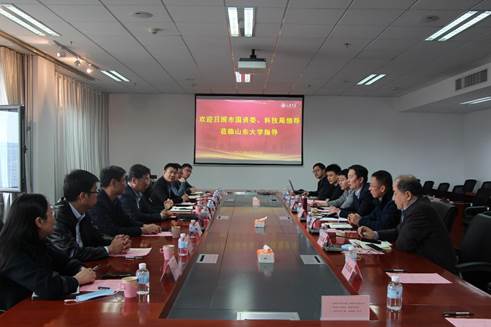 2022年2月28日,日照市国资委党委书记、主任陈凯,科技局党组书记、局长夏平一行来beat365在线唯一官网进行交流调研。beat365在线唯一官网科学技术研究院技术转移中心主任兼副院长刘德宝出席座谈交流会,beat365在线唯一官网院长万熠教授主持会议。