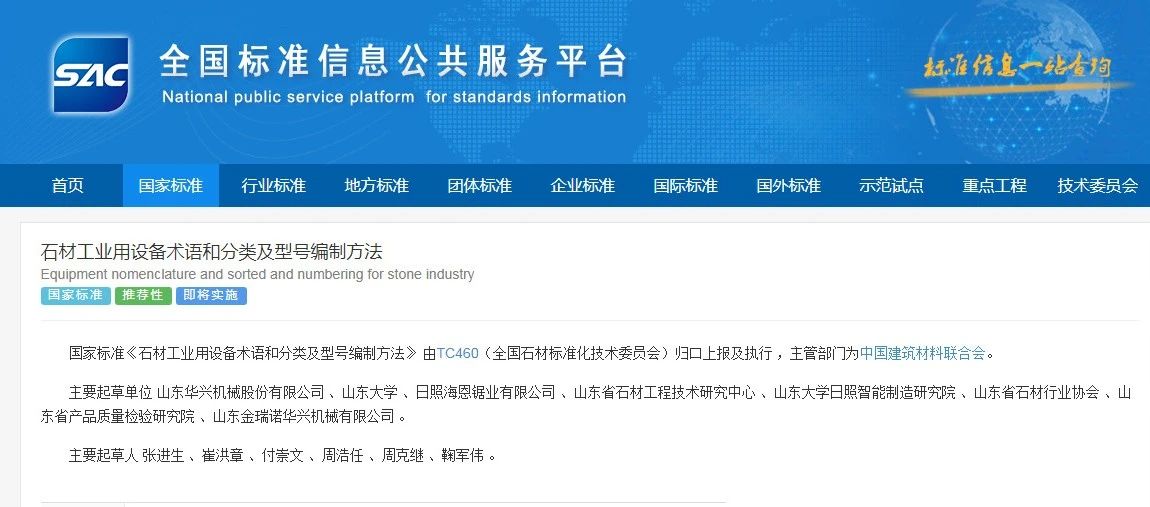 近日国家市场监管总局(国家标准化管理委员会)发布2021年第3号中国国家标准公告,批准beat365在线唯一官网张进生教授主持制订的GB/T39811-2021《石材工业用设备术语和分类及型号编制方法》国家标准正式发布。