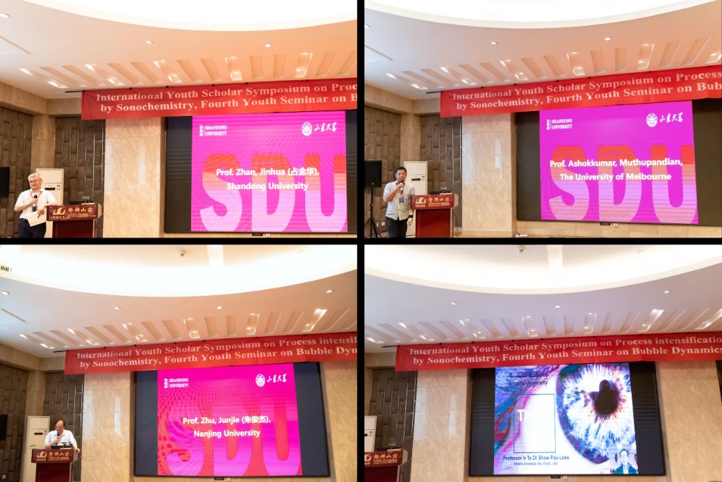 朱俊杰教授主持了特邀报告环节,Ashokkumar教授、王成会教授、Manickam教授分别作了题为《The relevance of bubble dynamics in ultrasonic/sonochemical processes》《Nucleation and dynamics of bubbles in a liquid cavity wrapped by elastic medium》《Greener and energy-efficient intensification of nanomaterials and nanoemulsions processes through cavitation》的学术报告。