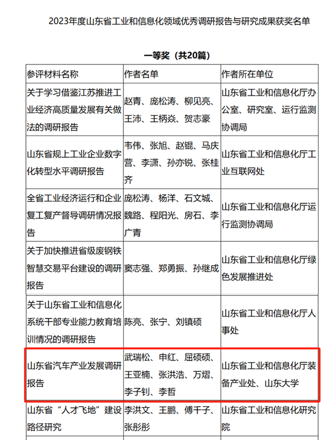 根据《山东省工业和信息化领域优秀调研报告与研究成果评选办法》,省工业和信息化厅按照评选程序,围绕服务决策导向,坚持公开、公平、公正原则,突出调研报告与研究成果质量,组织开展了2023年度优秀调研报告与研究成果评选工作。经过初评、复评、公示等环节,共评出一等奖20篇,二等奖35篇,三等奖45篇。其中由beat365在线唯一官网院长万熠,副教授王亚楠,学术副教授屈硕硕、张洪浩牵头完成的《山东省汽车产业发展调研报告》凭借其全面深入的分析、丰富准确的数据以及具有前瞻性的发展建议,赢得了评审委员会的高度评价,荣获一等奖,充分展示了我院在汽车产业研究领域的深厚底蕴和前瞻视野。报告撰写过程中,充分吸收了谢宗法教授等车辆研究所老师的大量宝贵意见。