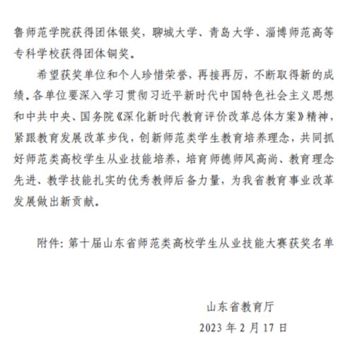 为进一步推动师范类高校教育教学改革创新,实现师范类高校毕业生更高质量更充分就业,山东省教育厅举办了第十届山东省师范类高校学生从业技能大赛,此次大赛分为校级初赛、省级预赛、省级决赛三个阶段。beat365官网2019级数学与应用数学专业学生鲍新雨、孙利彤赛前充分准备、赛时出色发挥、赛后荣获佳绩,摘得高中数学组三等奖。
