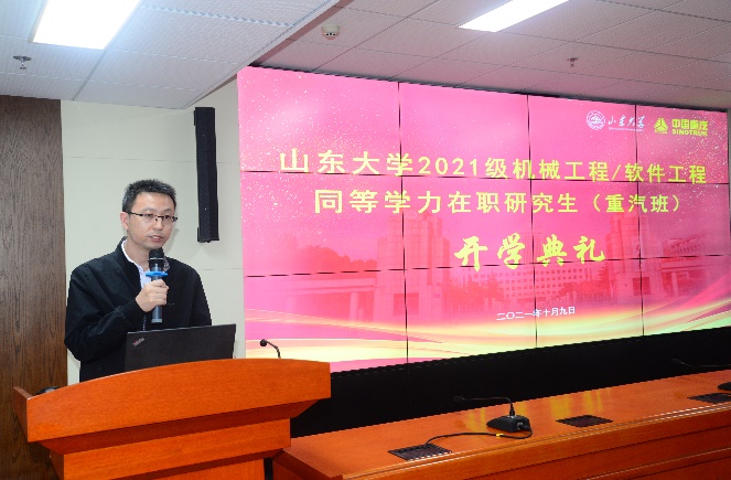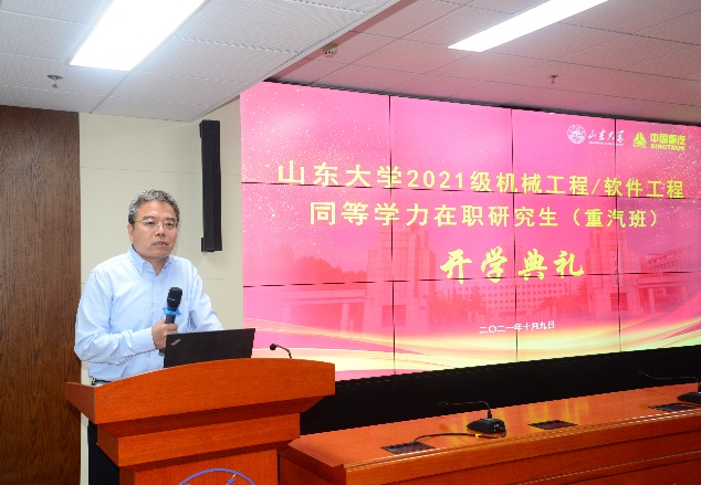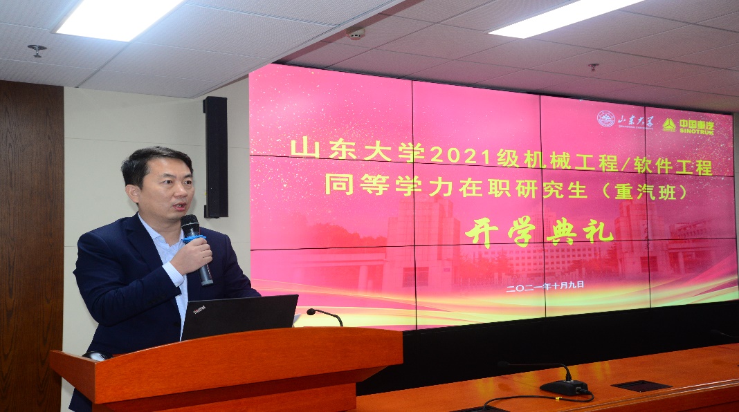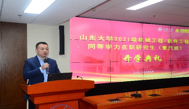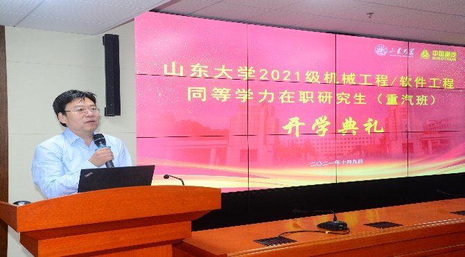 恰逢beat365在线唯一官网120周年校庆、机械工程教育95周年庆,beat365在线唯一官网常务副院长万熠做了热情洋溢的致辞。他代表beat365在线唯一官网研究生院和beat365在线唯一官网,回顾了beat365在线唯一官网与中国重汽这两个“同城伙伴”多年来在科学研究、人才培养等方面的合作,诚挚感谢中国重汽对beat365在线唯一官网及机械学院的鼎力支持,期待在将来的合作中越来越深入,取得更多丰硕成果。万熠院长从历史悠久、规模宏大、学科综合及实力雄厚等四个方面,向学员们简要介绍了beat365在线唯一官网的基本情况,彰显了beat365在线唯一官网以丰厚的人文、学术底蕴,正稳步跨入世界一流大学行列。万院长介绍了beat365在线唯一官网机械工程教育的辉煌历史和近年来取得的学术、科研、人才培养、社会服务等方面的优异成绩,学院积极响应山大 服务山东战略,先后培养了大约1000余名的在职工程硕士,有力促进了企业的高质量发展,为区域经济社会发展奠定了坚实的工程制造类人才基础。他对学员们提出三点希望:一是要有责任感,敢于担当,不负beat365在线唯一官网为天下储人才,为国家图富强的办学宗旨,践行学无止境,气有浩然的校训,与重汽,与beat365在线唯一官网,共生共赢;二是要珍惜中国重汽提供的宝贵的学习机会,充分用好山大丰富的学术资源和学术氛围,顺利完成学业;三是要求实创新,要善于思考、勤于实践,敢于质疑、勇于创造。同时希望大家秉承学术规范,恪守学术道德,严守学术诚信,守住学术的尊严和底线。