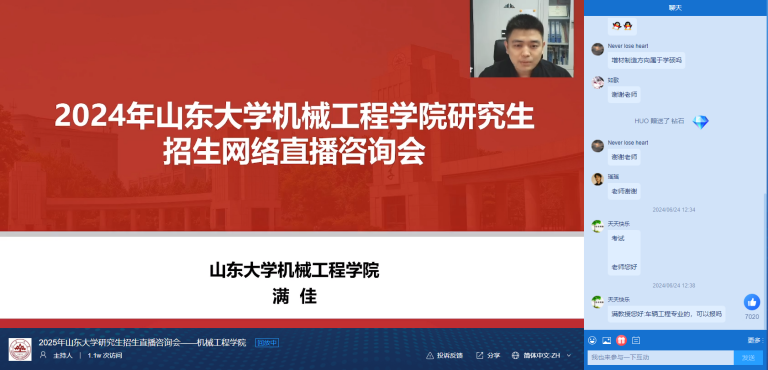 6月24日,学院首先举办了研究生招生网络直播咨询会。通过线上平台,院长助理满佳为考生们详细介绍了学院的基本情况、主要科研领域、研究生培养与毕业、招生简章等重要信息,并与考生进行了现场互动,解答了他们的疑问。