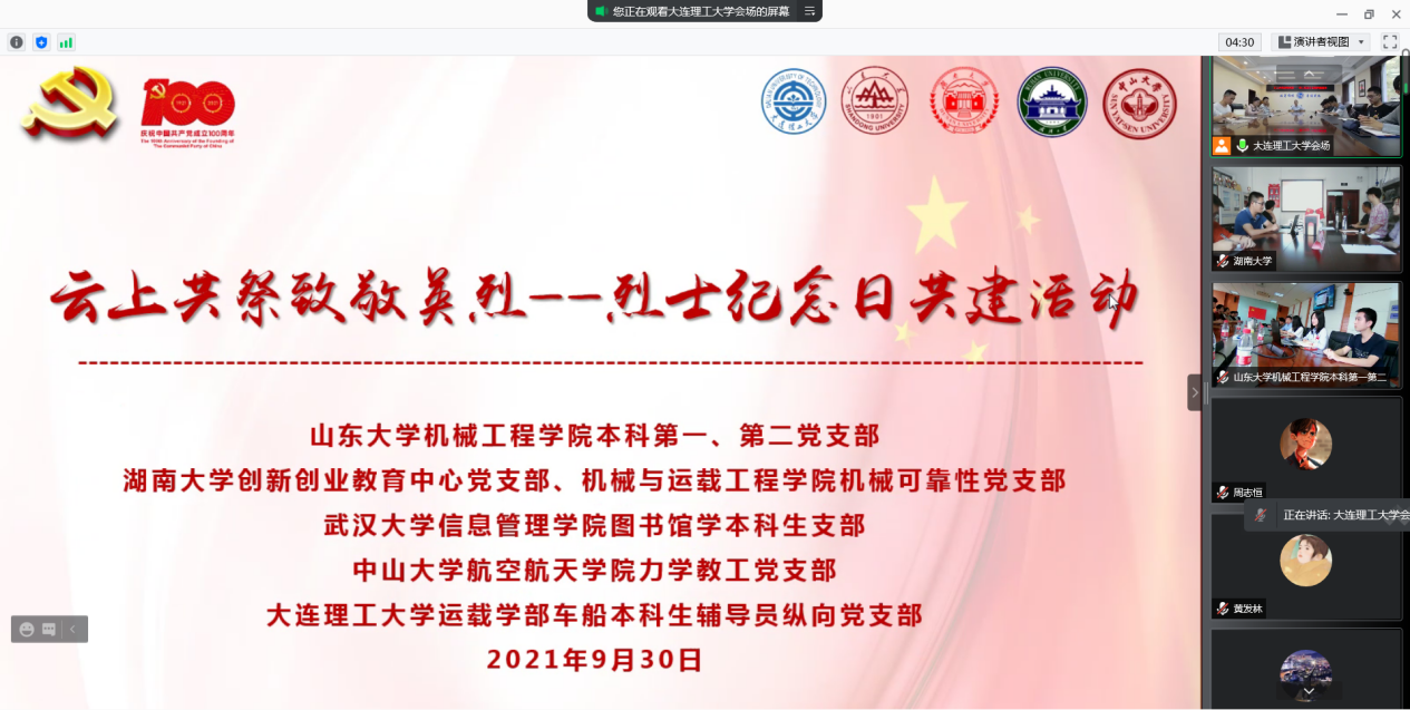 2021年9月30日是我国第八个烈士纪念日,为深切缅怀革命先烈、致敬人民英雄,铭记革命历史、坚定理想信念,beat365在线唯一官网本科生第一、第二党支部携手大连理工大学、湖南大学、武汉大学、中山大学等共5所“双一流”高校师生党支部开展“云上共祭致敬英烈”共建活动,以视频直播连线的方式走访各地爱国主义教育基地,交流研讨“我为群众办实事”工作经验,创新党史学习教育形式,深入挖掘红色教育资源。beat365在线唯一官网本科第一、第二党支部、大连理工大学运载学部车船本科生辅导员纵向党支部、湖南大学创新创业教育中心党支部、机械与运载工程学院机械可靠性党支部、武汉大学信息管理学院图书馆学本科生支部、中山大学航空航天学院力学教工党支部的党员参与了此次活动。