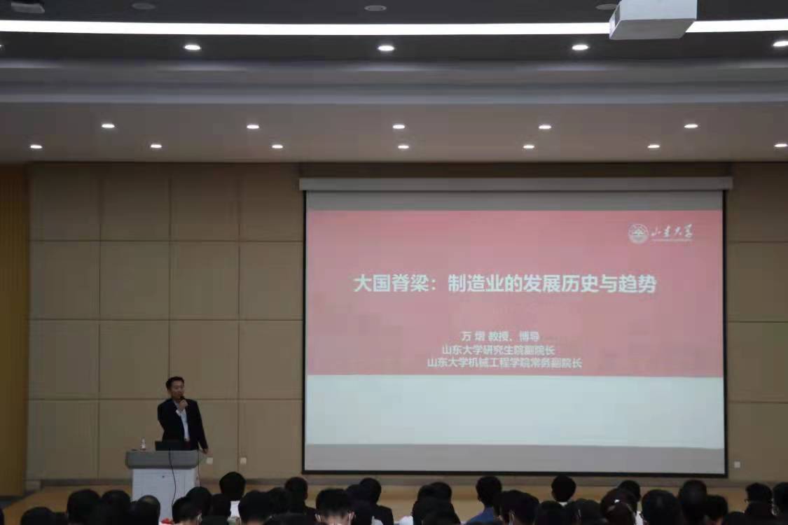 万熠以“大国脊梁:制造业的发展历史与趋势”为主题,为21级本科新生们讲述制造业的前世今生,帮助同学们认识机械制造对国家的重要意义。他讲解了国外的制造业发展现状,并以此为引,讲述了我国一系列制造业的发展形式、制造业发展的“三步走”战略、十大重点领域等制造强国策略,他从芯片、光刻机等同学们比较熟悉的科技产品岀发,帮助同学们全面理解“卡脖子”技术对国家发展的影响和当今制造业发展向智能制造转变的发展趋势,帮助同学们更直接、更深入的了解机械行业的发展前景。最后,万熠介绍了学院的学科发展、专业设置和雄厚的师资力量及本科生培养计划,增强了同学们的专业自信。