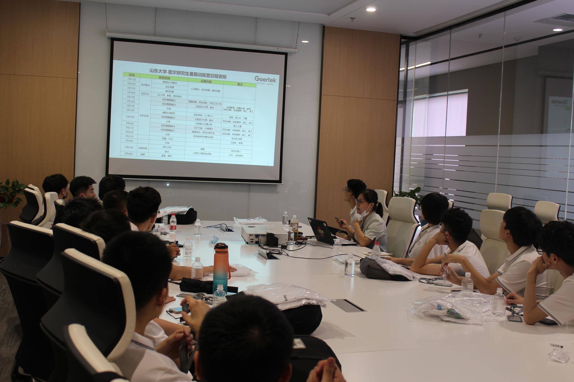 经过三个小时车程,上午11:00抵达潍坊高新区歌尔光电园产业园,歌尔人事部经理李雪进行了热情招待。滕玉军书记在歌尔第一会议室对训练营所有成员开展动员会议。他强调,所有营员要重视企业文化的体验,感受歌尔的企业文化,在企业文化中了解企业,丰富社会工作经验。将学校的科研与企业产业结合起来,找到自己的课题与歌尔产业的联通之处,将论文写在车间里。他提出将党团支部建立在训练营里,加强同学们的联系,在充分融合企业的同时注意安全,将山大的学无止境,气有浩然校训带进企业,展现山大的精神风貌。最后滕书记强调,紧绷疫情防控的神经,按照企业要求按时完成核酸检测,贯彻落实学校的和企业的疫情防控政策。