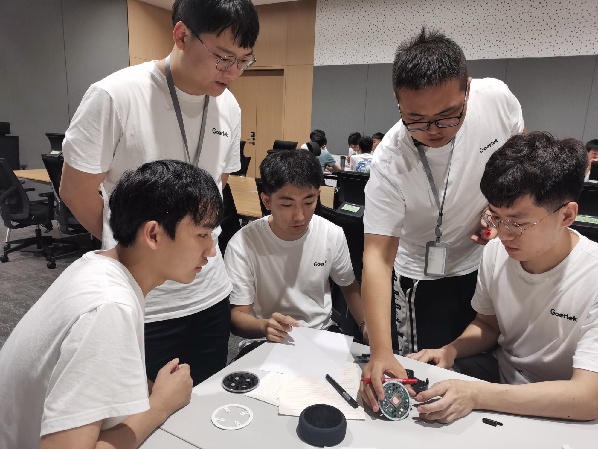 beat365在线唯一官网歌尔暑期训练营第五天,营员们在歌尔研发部门侯老师和单老师的教学指导下正式进行了第一天的项目课题模拟。