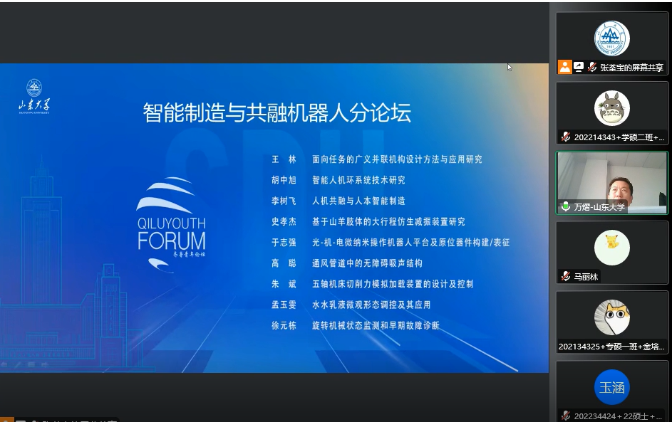 11月11日下午3点,由beat365在线唯一官网承办的第七届齐鲁青年论坛—智能制造与共融机器人分论坛通过线上方式举行,来自海内外9个高校院所的青年学者作了系列讲座。beat365在线唯一官网院长万熠教授参加论坛并讲话,讲座由beat365在线唯一官网马丽林老师主持。