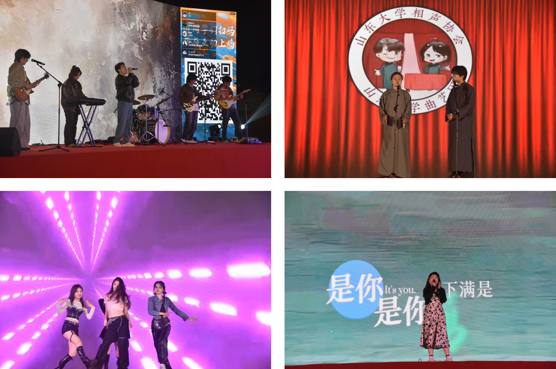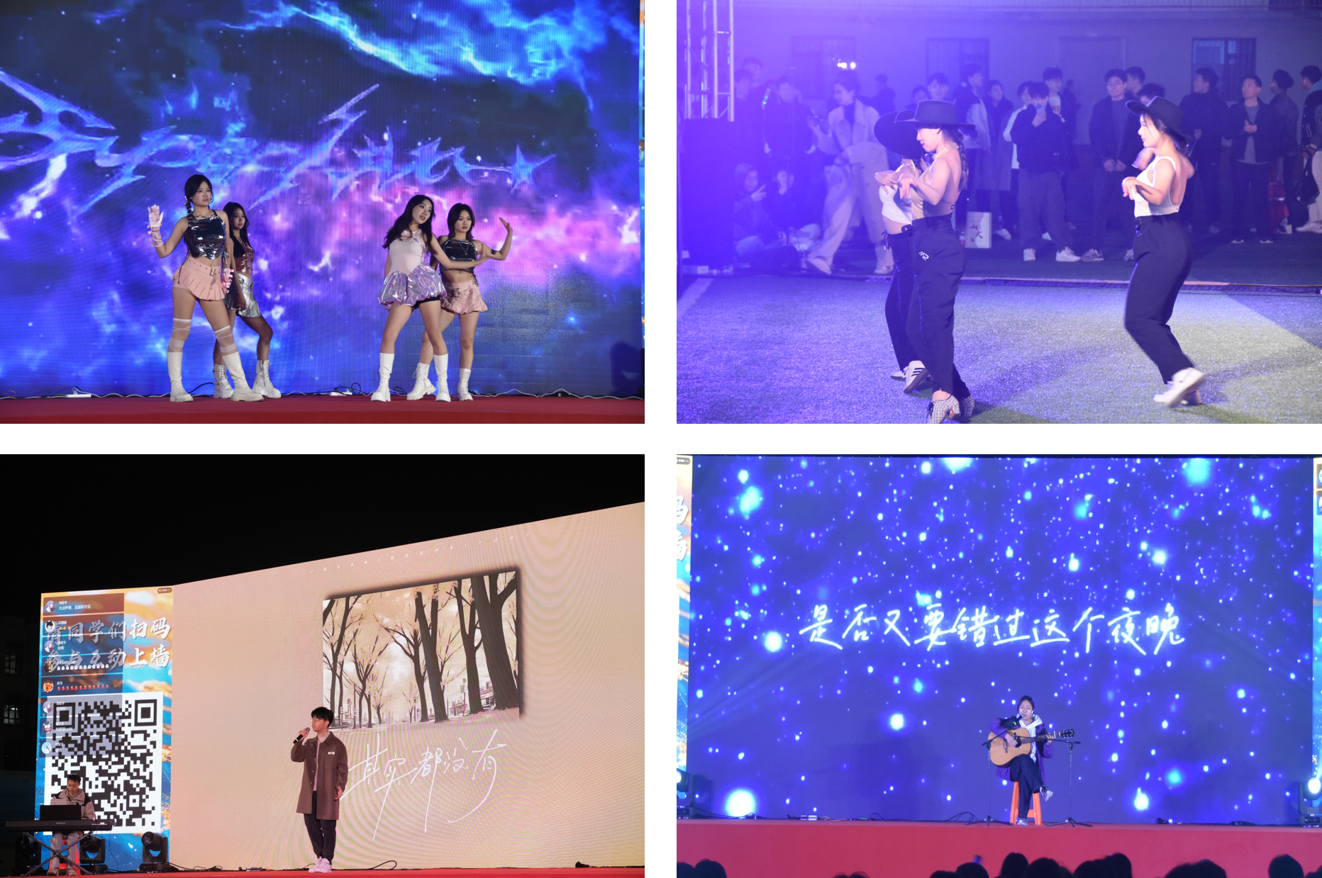 在晚会的第一篇章“巍巍学府,谱写新篇”中,街舞协会与体育舞蹈队的精彩表演《Supernova》和《Lady Jive》瞬间点燃了现场的气氛,热情四溢的舞姿让观众感受到青春的活力与激情;紧接着,歌曲《其实都没有》和《一万次悲伤》传递出激励大家前行的勇气与力量,深深打动了每一位观众。