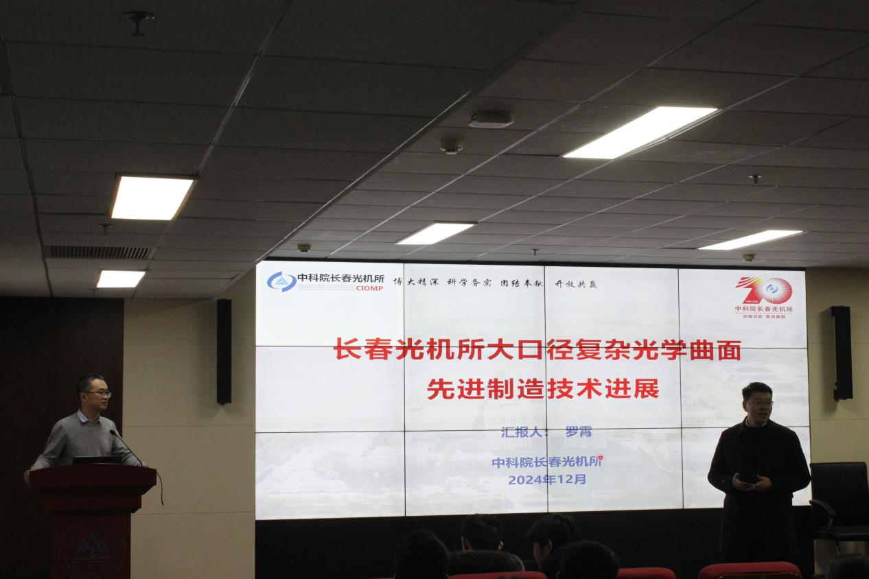 主讲人罗霄,博士,中国科学院长春光学精密机械与物理研究所研究员、硕士生导师,现任长春光机所光学集成制造中心技术总监。主要从事大口径复杂光学曲面先进制造技术的研究,带领团队攻克了包括大口径应力抛光组合高效加工、大口径复杂曲面高精度在位检测、大口径天地一致性重力卸载等一系列大口径反射镜高精度制造关键核心技术。本次讲座重点围绕中国科学院长春光机所在大口径复杂光学曲面加工、检测技术方面取得的进展进行介绍,详细讲解了长春光机所4m量级碳化硅反射镜坯制备技术、大口径碳化硅反射镜加工检测技术、大口径碳化硅反射镜表面改性及镀膜技术。现场学术气氛热烈而融洽,同学们结合自己的研究方向针对复杂光学曲面加工制造领域展开提问,罗霄对同学们的问题进行了详细专业的解答。